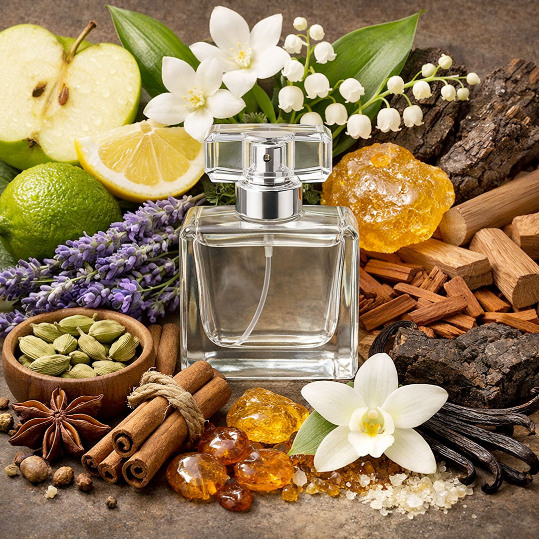 A crisp, refined fragrance where bright zest and green apple lead into an aromatic floral heart of jasmine, lily of the valley, spice, and lavender, grounded by a warm, sensual base of sandalwood, amber, patchouli, vanilla, and musk.